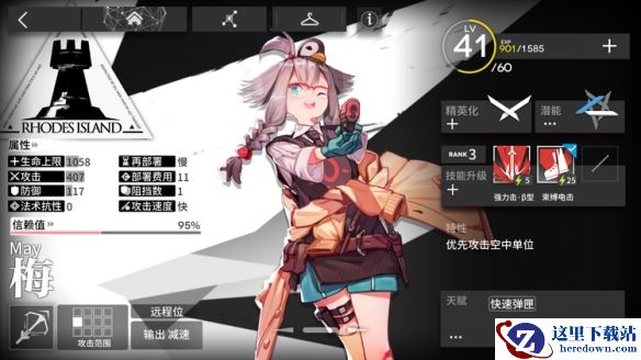 干员属性展示在干员详情页左部,干员名字上方,包括生命上限、攻击、防御、法术抗性、再部署、部署费用、阻挡数以及攻击速度8项。