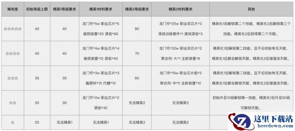 精英化有等级要求,且须消耗一定龙门币和职业芯片,外加一定量的常规材料。精英化1和精英化2均会解锁额外的台词。具体见下表: