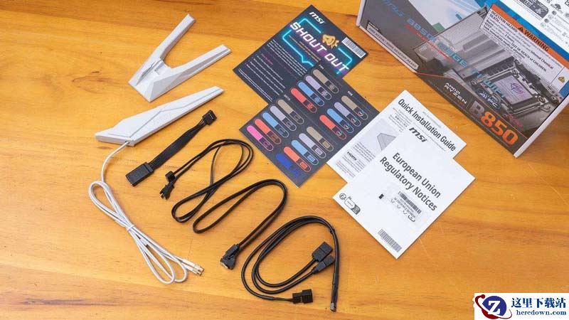 附件方面,提供了WiFi天线、主板EZ FRONT PANEL 跳针延长线、5V RGB转接线、SATA 硬盘线以及EZconn三合一扩展线和M.2 硬盘固定螺丝。