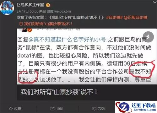 早在2014年就在WAR3中发布过同类玩法的“战三国”地图作者小嗨也在这时出现,他在声明微博下说:“对对对,这世界都是巨鸟多多创造的。”文字后面附带了一个狗头。而巨鸟多多则在回复中称小嗨“阴阳怪气”。