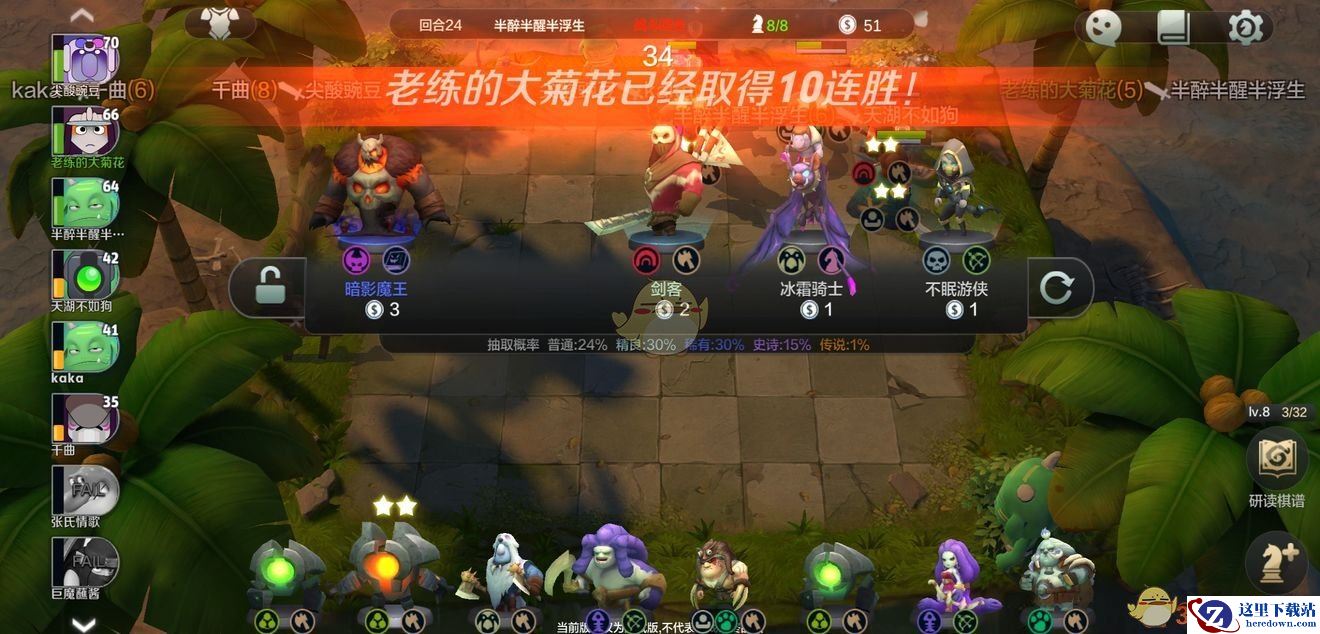 然后留钱上八级,给紫卡升升星,末日一定尽量升三,其他紫卡2星就好,海象、大鱼人、石头人一个个升星,千万别太贪,同时存好几个只会导致一个也升不成三星,成型以后就是随便打,连胜赚钱美滋滋。