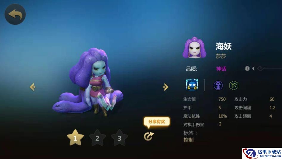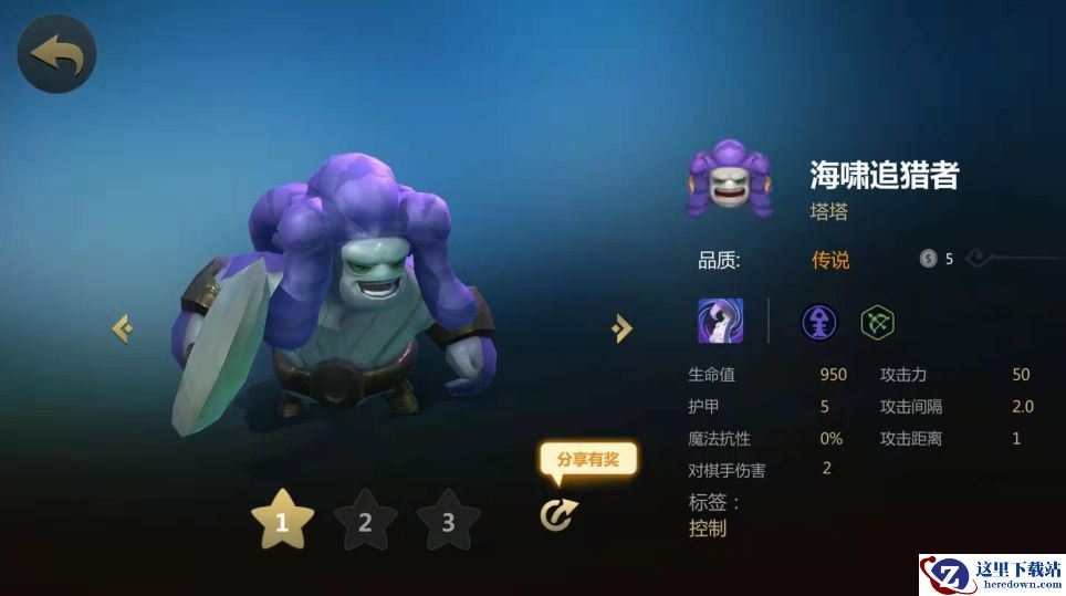海妖是猎人阵容中前期的一个控制型棋子,技能范围广非常好用,但是1星的海妖回蓝有点慢,如果有回蓝装不妨丢给她,2星后可以把她放在前排,追2星即可。
