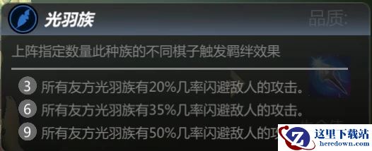 光羽族的羁绊效果为场上有3个6个9个不同光羽族单位时为所有光羽族单位提供,20%,35%,50%三个不同层次的闪避效果