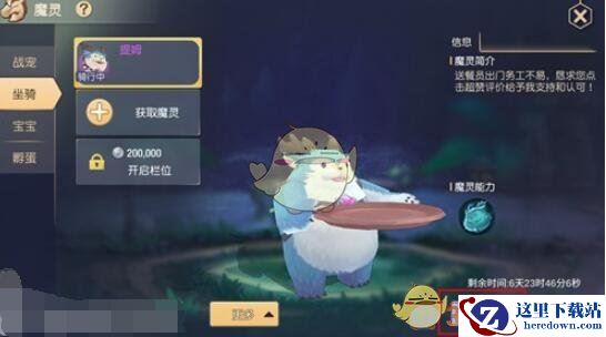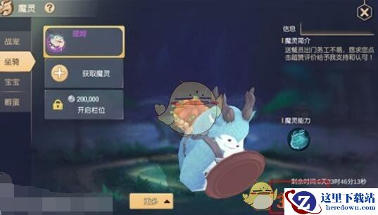 在魔灵里可以进行战场、坐骑、宝宝、孵蛋的操作,点击坐骑,就可以看到新获得的提姆了,右下角有两个选项,一个是骑乘,可以骑乘坐骑,一个是跟随,没有太大作用。