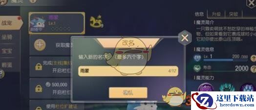 现在就可以看到获得的战宠信息了,点击宠物下方的更多,弹出的选项最下面一个就是改名,点击改名就会出现改名框输入新的名字后,点击确认,宠物改名就成功了。