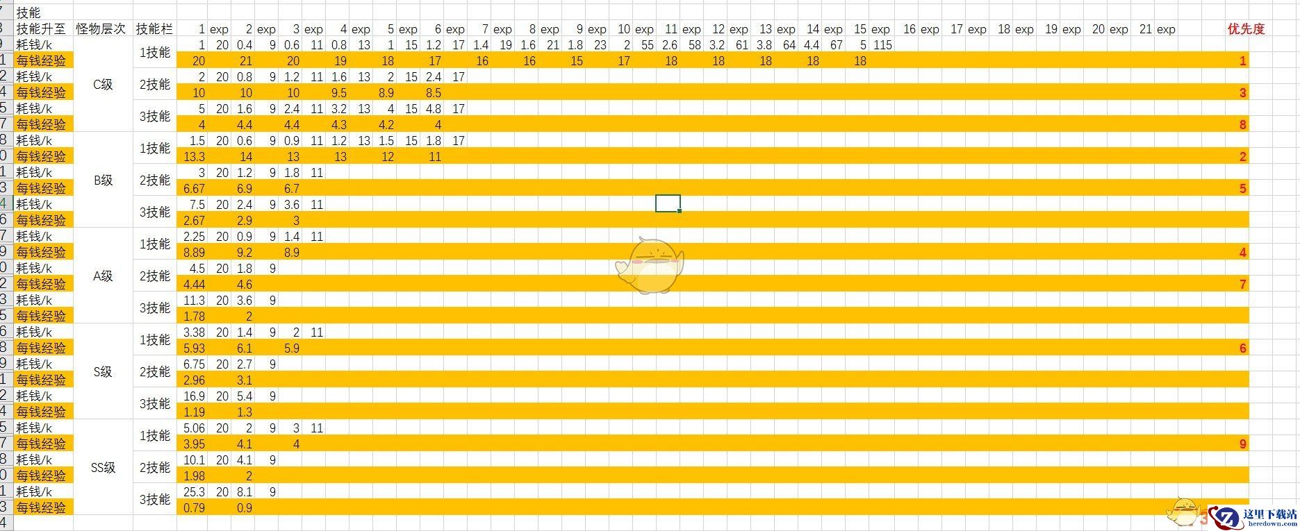 观察标黄行中的数据,每金钱获得的经验越高越好,所以有了钱以后,先升C级怪的1技能,获得的经验最多,当C级怪的1技能都升满以后,再升B级怪的1技能,以此类推,优先顺序如下:
