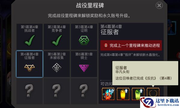 每通关一幕就会解锁一项战役里程碑,可以获得更多的特权,购买高级水晶获得打折、每日水晶和四小时水晶品质上升、解锁新的英雄水晶,这些功能非常重要,通关第五幕解锁的大师水晶可以抽出5星英雄,通关第六幕的其实水晶可以抽取6星英雄。