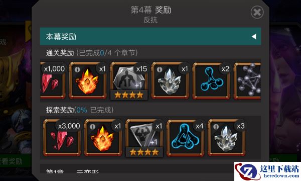除了通关的奖励以外,还有探索100%的奖励,每一幕都被分为六章,每一章都有不同的通关路线,想要达到探索100%就必须将所有路线都打通,非常耗费体力,但是奖励也很丰厚,第一幕就奖励一个三星英雄水晶对前期发展来说还是很重要的。