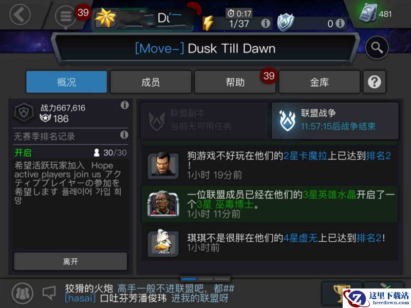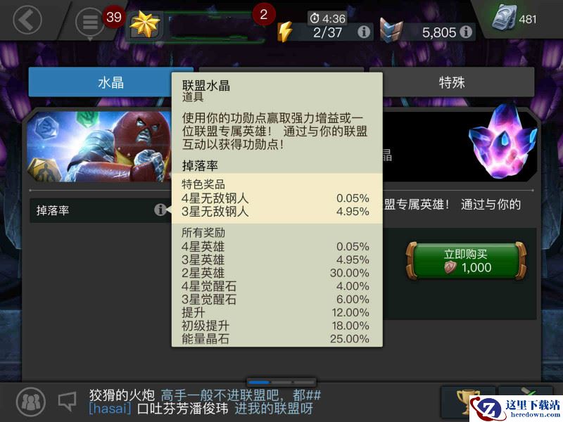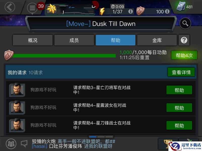 除了这些,联盟其他成员还可以帮你打完竞技场的英雄快速恢复体力,帮助其他成员的英雄恢复体力还可以获得功勋点,1000功勋点就可以开启一次联盟水晶,奖励非常丰厚。
