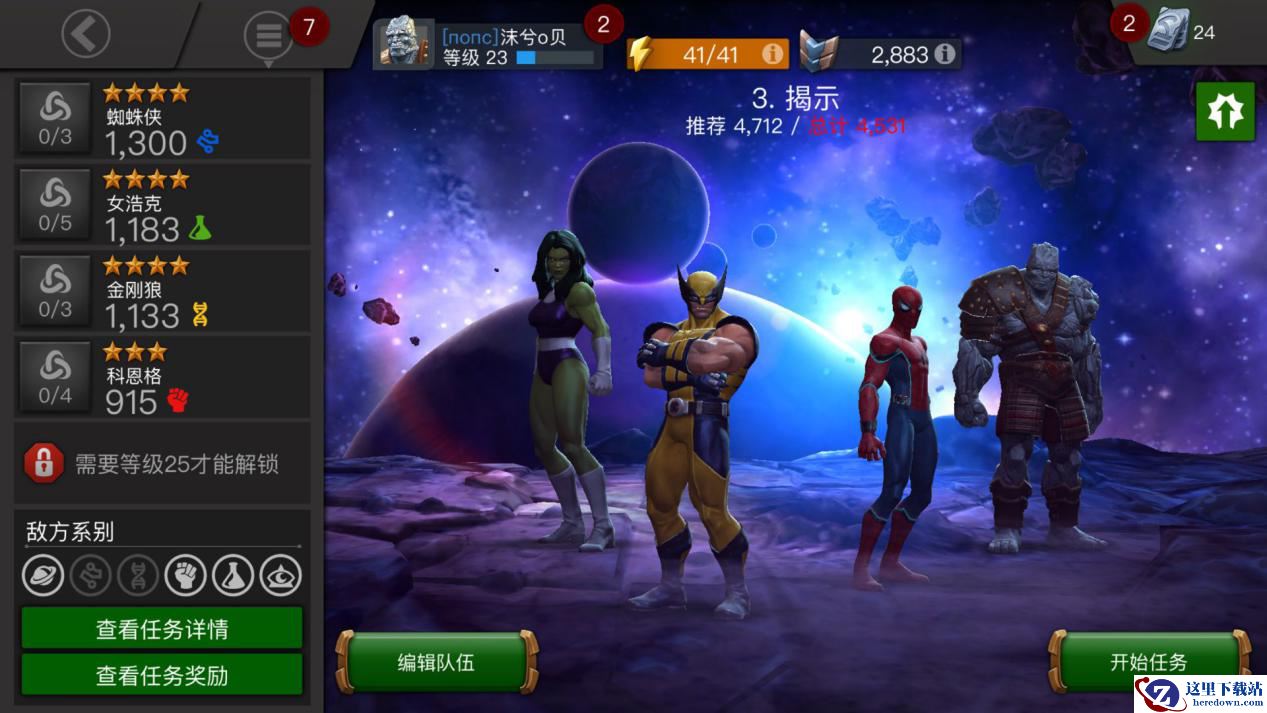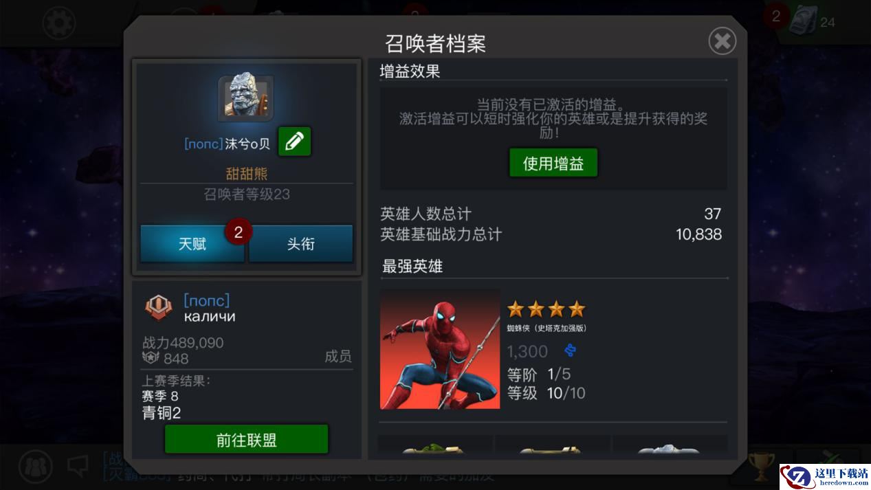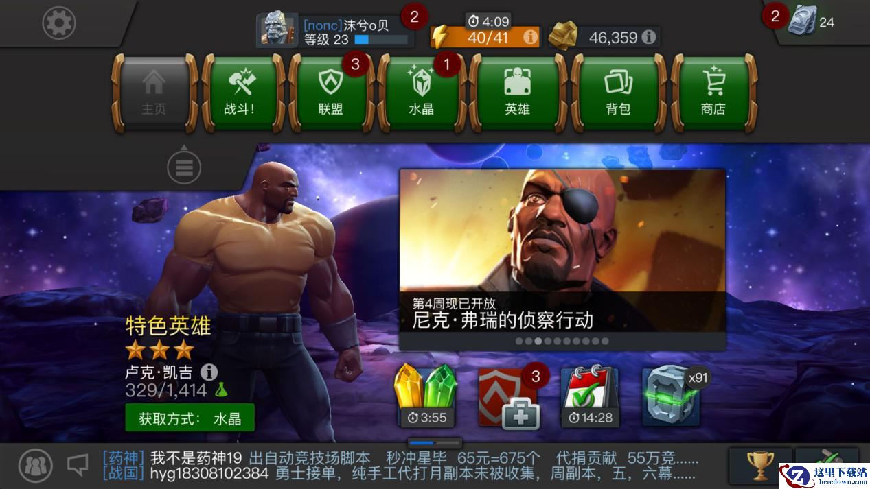 联盟是玩家之间交互的地方,同时在联盟中你也会和其它敌对联盟交战。当你第一次进入联盟后就能获取到免费抽英雄的机会,简单点说加入联盟之后系统会送一个高级英雄水晶,这可能就是联盟对新成员的一种欢迎仪式吧。当然联盟平日里还会有独特的副本供玩家体验,这些副本都是有材料、英雄的掉落,加入一个相对活跃的联盟是每一个《漫威:超级争霸战》玩家的第一步。