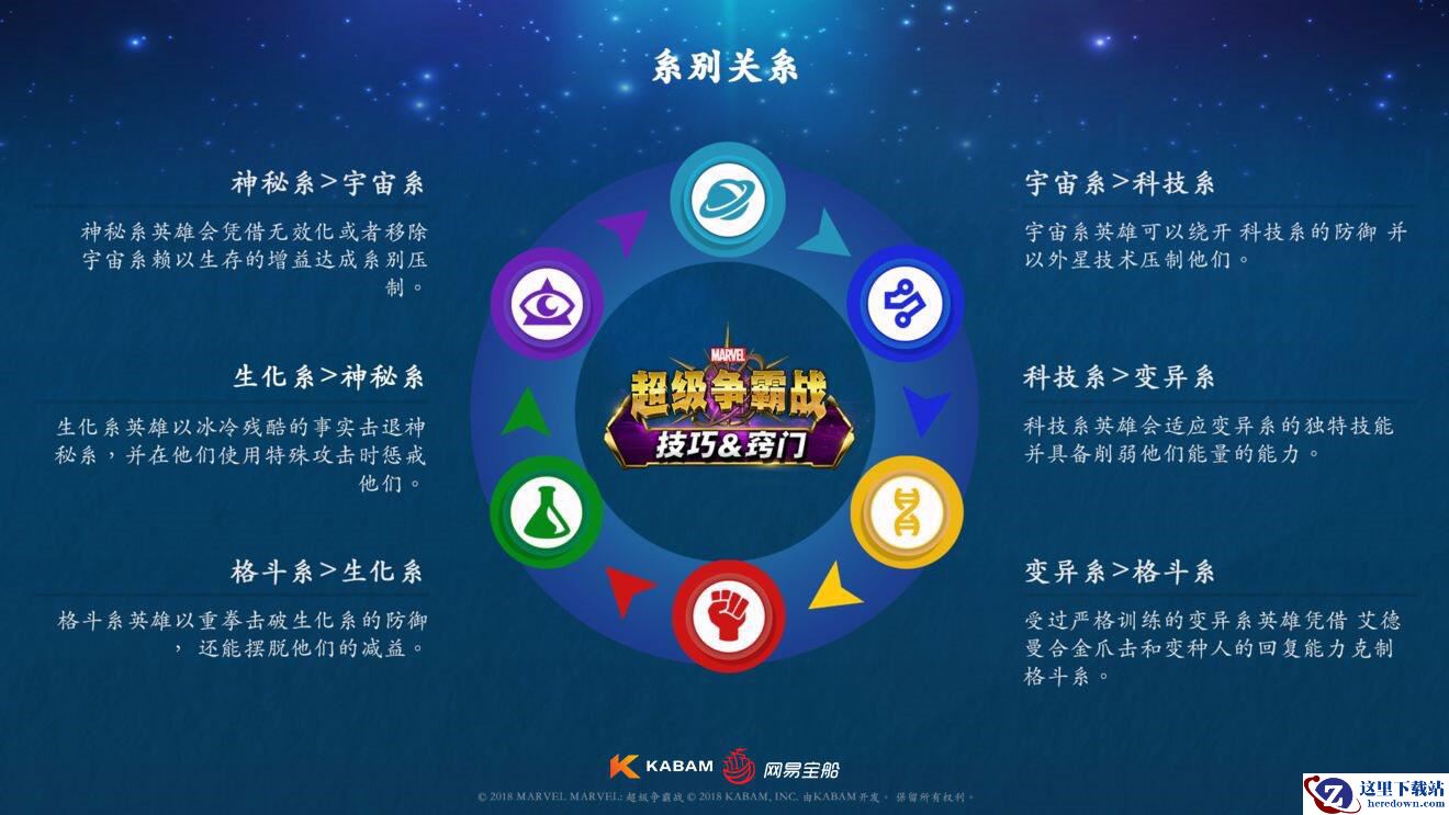 系别的优胜劣汰往往决定了你的胜败,了解英雄之间相互克制关系在上场前选择你需要的系别对抗敌方超级英雄成为了游戏的关键。克制关系为:宇宙系>科技系>变异系>格斗系>生化系>神秘系>宇宙系。但若是玩家选择的系别英雄之间没有克制关系,那就不会触发任何额外增减益buff。
