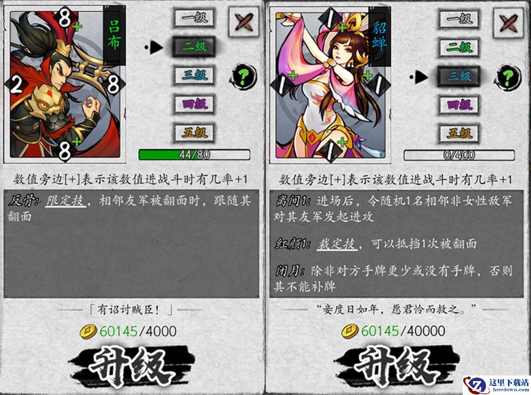作为一款全新的卡牌游戏,《英雄爱三国》及保留了卡牌游戏的养成特色,又为玩家提供了更多崭新体验。玩家可以通过刺激的天梯对决提升段位,并解锁更多武将。在对决中会获得武将卡牌及金币资源,可以用来提升武将的实力。升级后的武将,将会有更多的技能效果供玩家选择。玩家也可以去演义模式中,体验经典的三国剧情。根据剧情设置的卡组套路最大程度上还原了剧情故事。带有一定随机性的剧情关卡对战,对于玩家来说也是一个不小的考验。