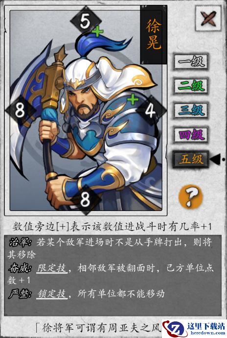 徐晃左、下点数偏高,理想位置为右上角3号位,与魏国阵营里的典韦一样是个白板武将。