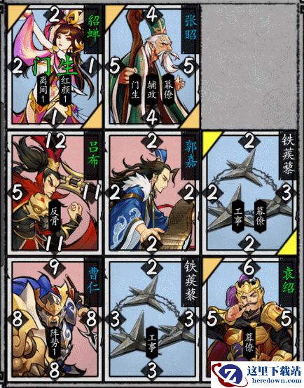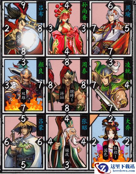 吕布,战神,武力值最高没有之一,除了左侧比较薄弱,其他三维还是很客观的,但是,自带的反骨技能会影响较大,使用时需要慎用,一般后手较多。