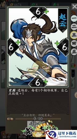 3、赵云:一般被包围后需要他来进行解围,周围敌人越多,他的增益越高,如果你是先手,敌方的工事呈品字型,也可以先放赵云。七进七出,人中之龙!