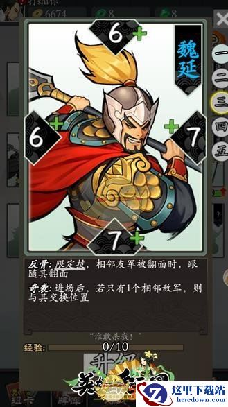 4、魏延:在用的时候需要事先考虑对方能不能有牌解掉靠近魏延的武将,因为翻魏延只需要把他身边的武将翻面,他会自动翻面,所以一般魏延都是后面拿出来解场用,善于利用,往往能够翻盘锁定胜局。