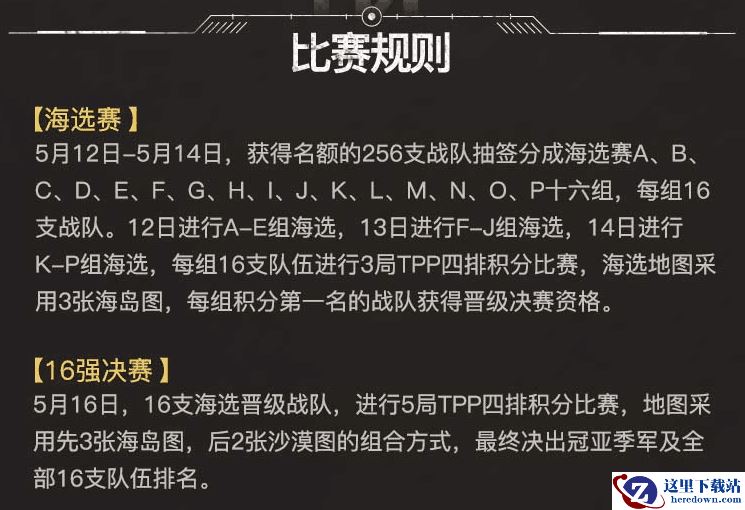 比赛采用抽签模式,将报名的256支战队间抽签分成A、B、C、D、E、F、G、H、I、J、K、L、M、N、O、P16组,每组由16支战队构成。在5月12日进行A-E组海选,13日进行F-J组海选,14日进行K-P组海选,每组的16支战队将会进行3局TPP模式的海岛地图积分赛,在三轮海选赛结束后,积分第一的战队将获得晋级决赛的资格。