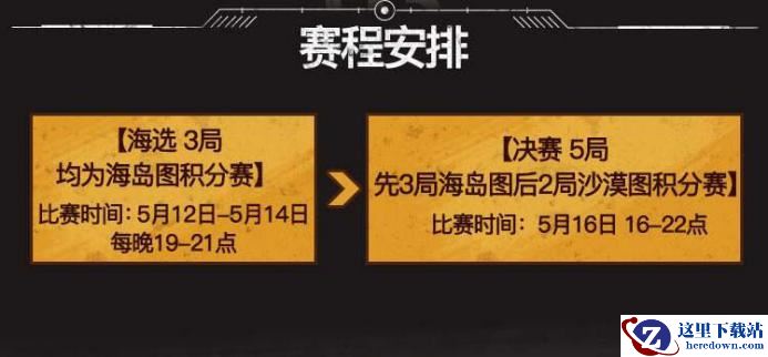 进入决赛后的16支队伍将于5月16号16-22点展开决赛。决赛分为5局,也采用积分制,5局之后根据队伍积分进行排名,决出最终的赢家。5局决赛,前3局是海岛地图,后2局是沙漠地图,不同的地图设定也考验了战队成员的适应能力,要想获得好成绩就需要对两张地图都有深刻的游戏理解能力。