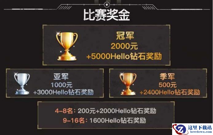 本次比赛有着丰厚的奖励,最终排名第一的战队将会获得2000元+5000Hello钻石奖励、亚军队伍将获得1000元+3000Hello钻石奖励、季军队伍将获得500元+2400Hello钻石奖励,4-8名获得200元+2000Hello钻石奖励,9-16名将获得1600Hello钻石奖励。可以说只要通过了海选赛,参与决赛的队伍都能获得奖励,要想获得更高的奖励就要取决于队伍最终排名。