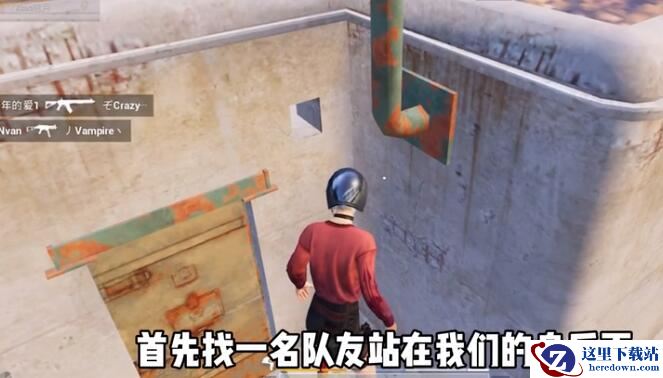 文字攻略:来到碉堡铁门边上的墙角,让队友站在身后卡位,然后不停的按跳跃键就能卡进碉堡的里面!