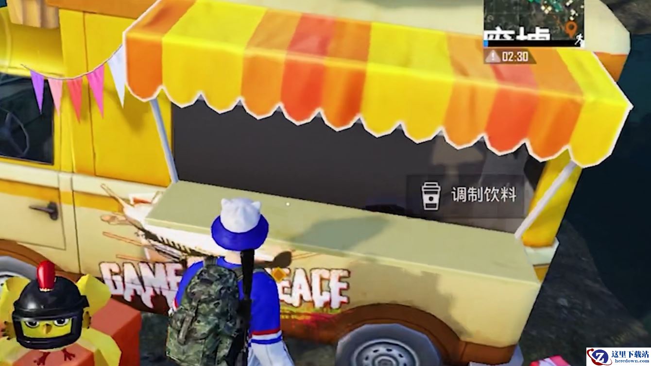 玩家在降落到小鸡图标位置后,可以找到一辆金黄色的饮料车,车前放着很多礼物盒,礼物盒子的上面还有一只带着三级头盔的小鸡。