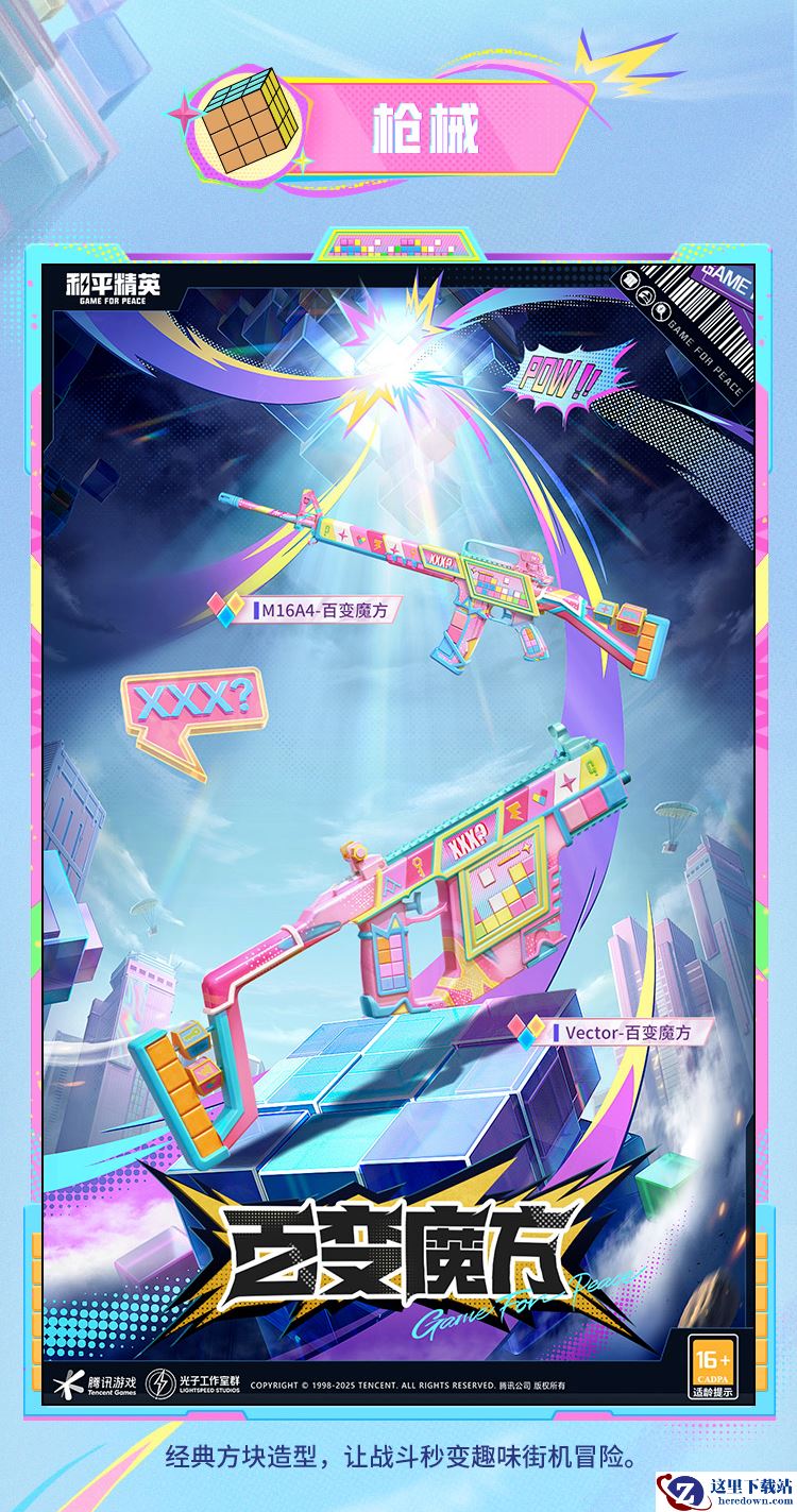 1、【百变魔方】系列涵盖多款热门武器皮肤,包括 M16A4、Vector 等,枪身以渐变金属质感为基底,点缀可旋转的魔方模块,射击时模块会随弹道产生动态位移,配合粒子特效形成 “子弹穿透魔方” 的视觉奇观。