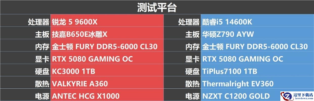 本次评测使用的显卡是RTX 5080,并根据RTX 5080的定位和两个平台的特性,模拟实际装机时的配置。AMD平台用的是B650E主板,保证了主板接口数量,也能满足锐龙5 9600X的供电需求,内存则是配了DDR5 6000 CL30的低延迟内存,水冷散热配了大约350元价位的入门级水冷,给88W的CPU散热,绰绰有余。英特尔平台这边,LGA1700主板已经有很多型号停产,想挑一个好看好用的主板并不容易,Z790 AYW的规格和售价与B650E冰雕X比较接近,所以选了这个,内存则是同规格的D5 6000 CL30,散热器选择稍微好一点的600元价位的EV360。