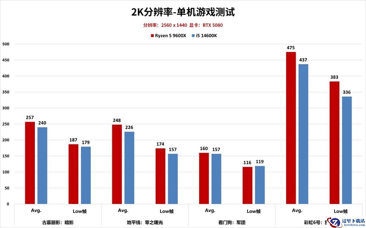 通常测试CPU的游戏性能,我们会采用1920 x 1080的分辨率,尽量将负载留在CPU上而不是显卡上,但我们考虑到RTX 5080的次旗舰定位,大概率没什么人会用这张显卡跑在1080P下,所以我们决定测试2560 x 1440分辨率以及3840 x 2160分辨率,看看在更贴近实际情况的游戏场景里,锐龙5 9600X和i5 14600K谁更强。