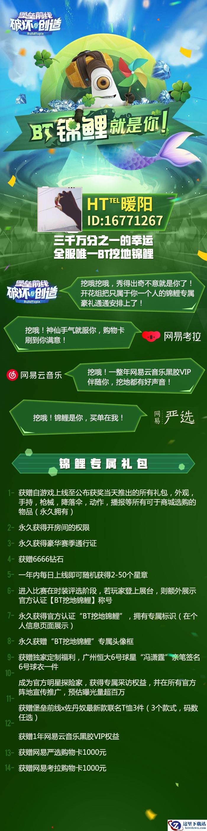 三千万宠爱集于一身,自然不能敷衍了事!为此,《堡垒前线》携手网易考拉、网易云音乐、网易严选等诸多网易系品牌,为BT锦鲤送出丰厚礼包。其中包括: