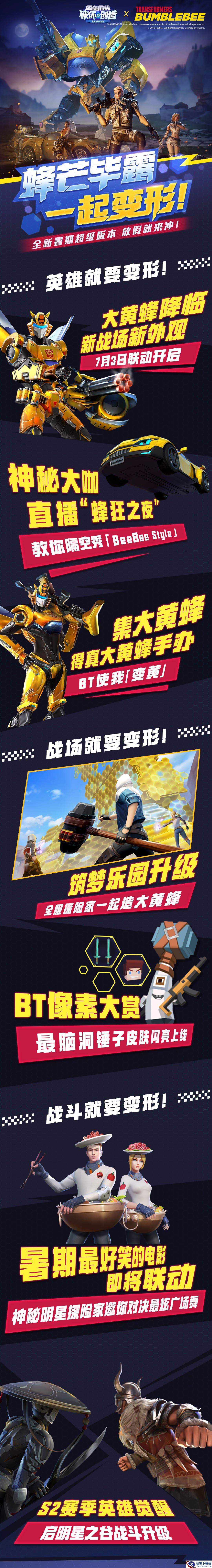 在7月3日上线的暑期超级版本中,大黄蜂限时模式将圆不少探险家的超级英雄梦!探险家们可以在单排模式中积累火种源,化身成全场唯一一位大黄蜂汽车人,以一己之力制霸百人场!而变身大黄蜂的探险家被击败后,将原地留下火种源,拾取火种源的探险家将继续变身为全新大黄蜂。在轮番火种源争夺中,人人都有机会变身超级英雄!