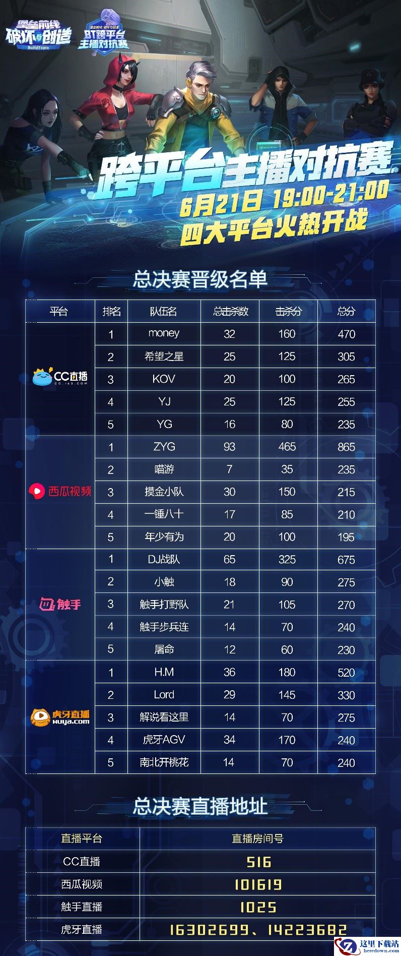 6月14日,《堡垒前线:破坏与创造》跨平台主播对抗赛正式开启!来自CC直播、虎牙直播、触手直播、西瓜视频四大人气直播平台的主播,集结于启明星之谷,手持大锤,肩扛火箭炮,脚踏滑板车,为玩家秀出了一轮轮骚操作!现在,四大直播平台预选赛已经结束,决赛晋级名单已经产生,谁能最终问鼎启明星之谷?很快答案就将揭晓!