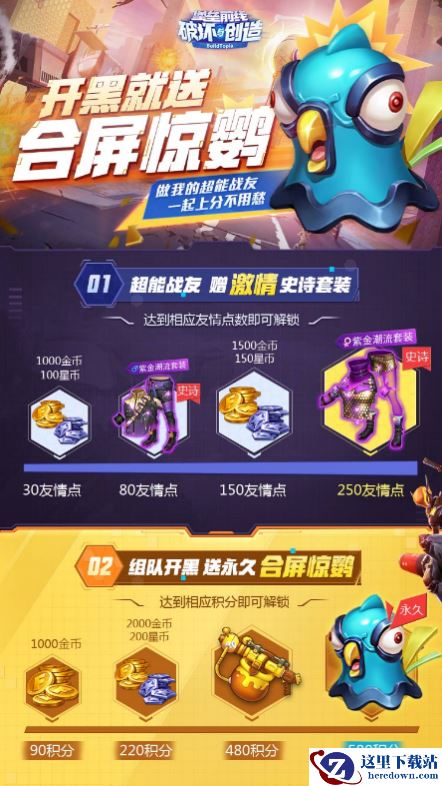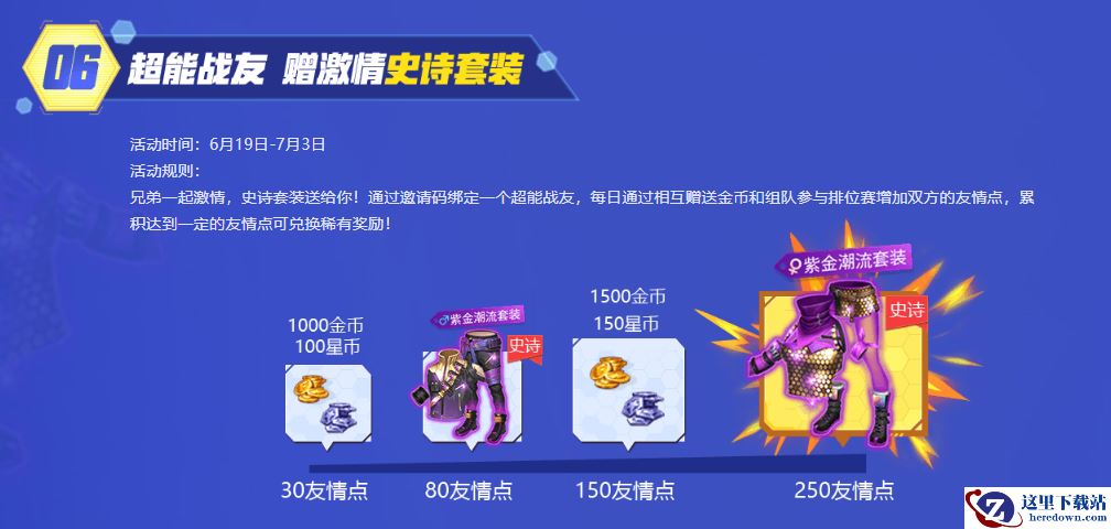 在探险家驰骋于启明星之谷时,也别忘了把自己的现实好友也介绍给《堡垒前线》,一起开黑,默契满分!在活动期间,每位探险家都可以邀请一位好友绑定成为超能战友,每天通过相互赠送金币、组队参与排位赛等方式增加彼此的友情点。随着友情点的累积,就可激情解锁史诗紫金潮流套装等丰厚奖励!相信穿上这件象征着友谊的酷炫时装,你会成为整个启明星之谷最靓的崽!