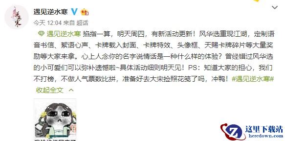 《遇见逆水寒》每次更新的时候都会给玩家一个大惊喜,这次也不例外!还没到周四的版本更新日,官博@遇见逆水寒就兴冲冲的预告:“风华选重现江湖啦!不打榜,不做人气票数比拼。”