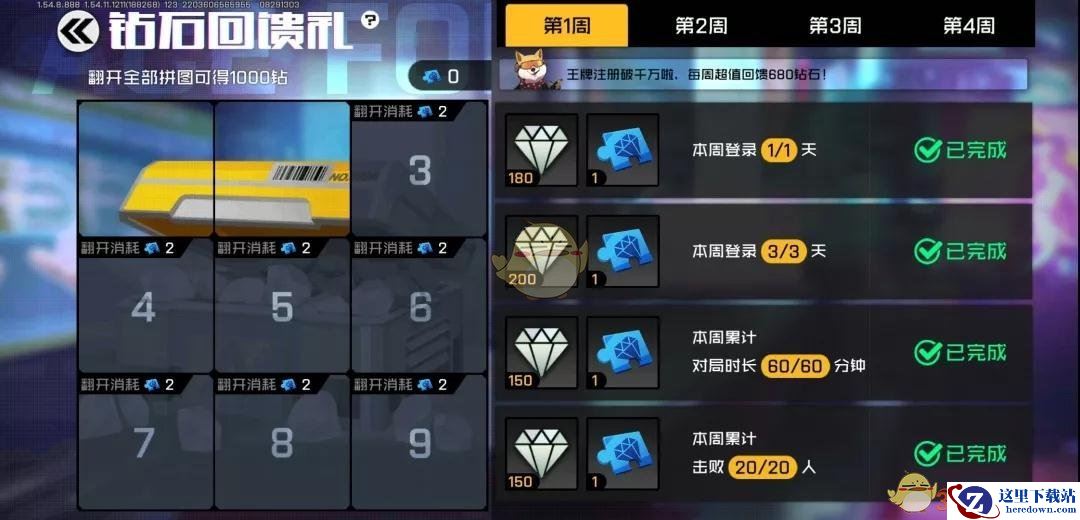 总结:第一周内,累计登录3天,对局时长累计达到60分钟,并累计击败20人,即可获得第一周全部奖励——680钻石+拼图碎片*4。