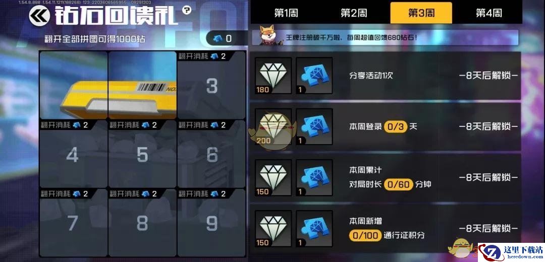 总结:第三周内,分享钻石回馈礼活动1次,累计登录3天,对局时长累计达到60分钟,并周内新增通行证积分100分,即可获得第三周全部奖励——680钻石+拼图碎片*4。
