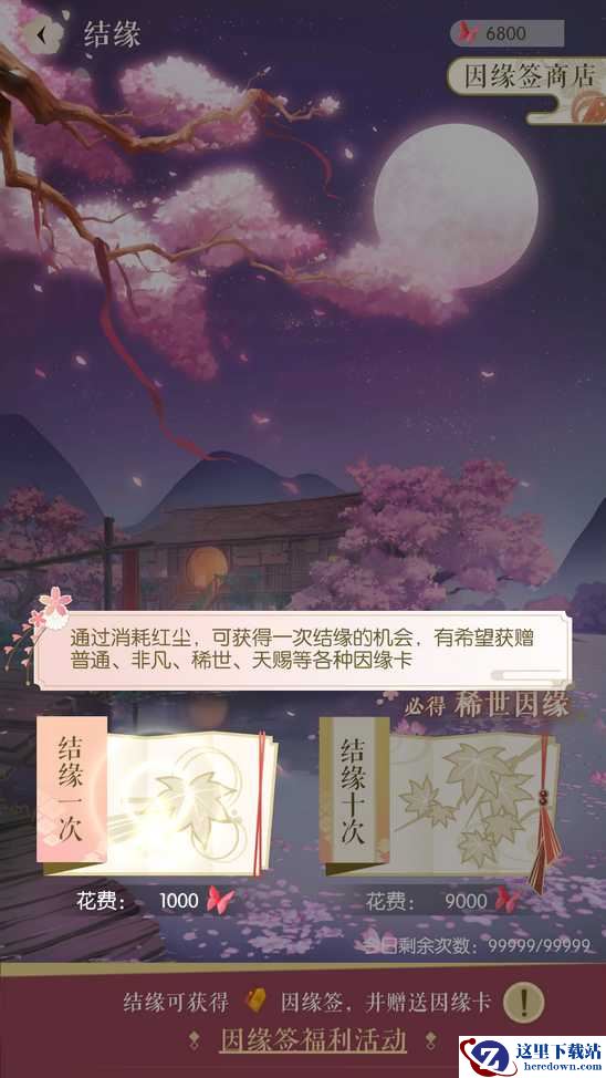 3、进入结缘后,每消耗1000点红尘可结缘(抽卡)1次,消耗9000点红尘可结缘10次(必定得稀有因缘卡)。
