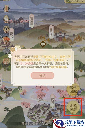 1、在【江湖】中点击右下方的【开始游历】按钮可开启游历。或者游戏离线十分钟后也会自动开启游历挂机。
