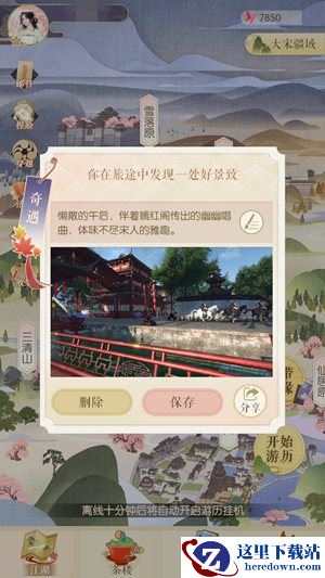 3、在游历场景可以看到有红色枫叶图标,点击枫叶可以触发故事剧情。过完故事剧情可以获得各种奇物、奇观、书信奖励。你也可以选择挂机,等待自动触发奇遇。