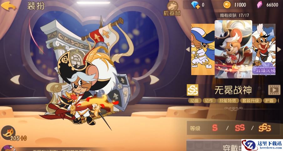 在欢乐的猫鼠追逐中,剑客杰瑞·无冕战神在1S状态下即能拥有皮肤配套技能外观和华丽特效。使用主动技能“剑与苹果”,苹果在玫瑰剑气之中被快速切成数瓣,为无冕战神的健康提供保障;在使用武器技能“剑舞华尔兹”时,无冕战神将使出绚烂的剑术,剑气中夹带着玫瑰花瓣,彰显古典贵族之美;第二武器技能“格挡之剑”则会发出金色剑气和玫瑰花瓣,为无冕战神抵挡敌人的伤害;