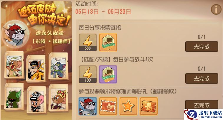 在有效投票达到指定次数后,大家将通过邮件获得奖励,包括皮肤碎片兑换券、星星、邮票,投票达到16次,还可以免费获取米特周年庆B级皮肤“修理师”!