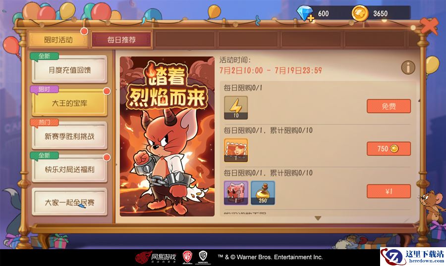 踏着烈焰而来,地狱中的恶魔降临人间。华纳兄弟互动娱乐正版授权,网易精心研发的《猫和老鼠》手游7月2日迎来更新,恶魔杰瑞典藏皮肤“火云大王”盛大登场,恶魔杰瑞角色限时七折,还有精彩活动同步上线,享受快乐竞技,收获丰厚奖励!