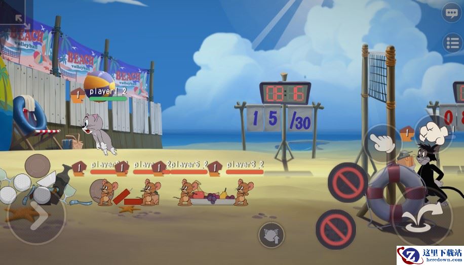 虽然度假很温馨,但竞技时刻必须严阵以待!按照球赛惯例,比赛将分为2组队伍,每组由5位玩家组成。游戏中两队玩家通过击飞皮球进行对抗,如果能将皮球击落在对方阵营就可得1分,一方累计分数达30分后比赛结束。在《猫和老鼠》的沙滩排球玩法中,双方还可以利用定时刷新的道具投掷攻击对手,使对手进入“虚弱”状态无法继续比赛。