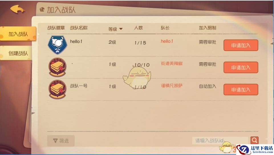 如果你不属于任何一支战队,可以在“加入战队”页面浏览当前所有战队的名称、徽章、宣言、等级、人数、队长和加入限制等信息,决定自己要加入的战队后,点击“申请加入”即可静候佳音。你也可以使用筛选功能,挑选出最适合自己的战队申请加入。