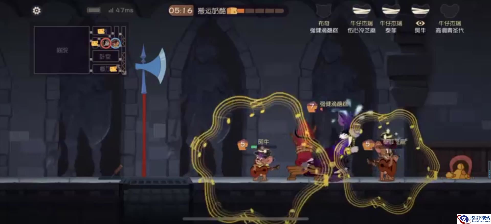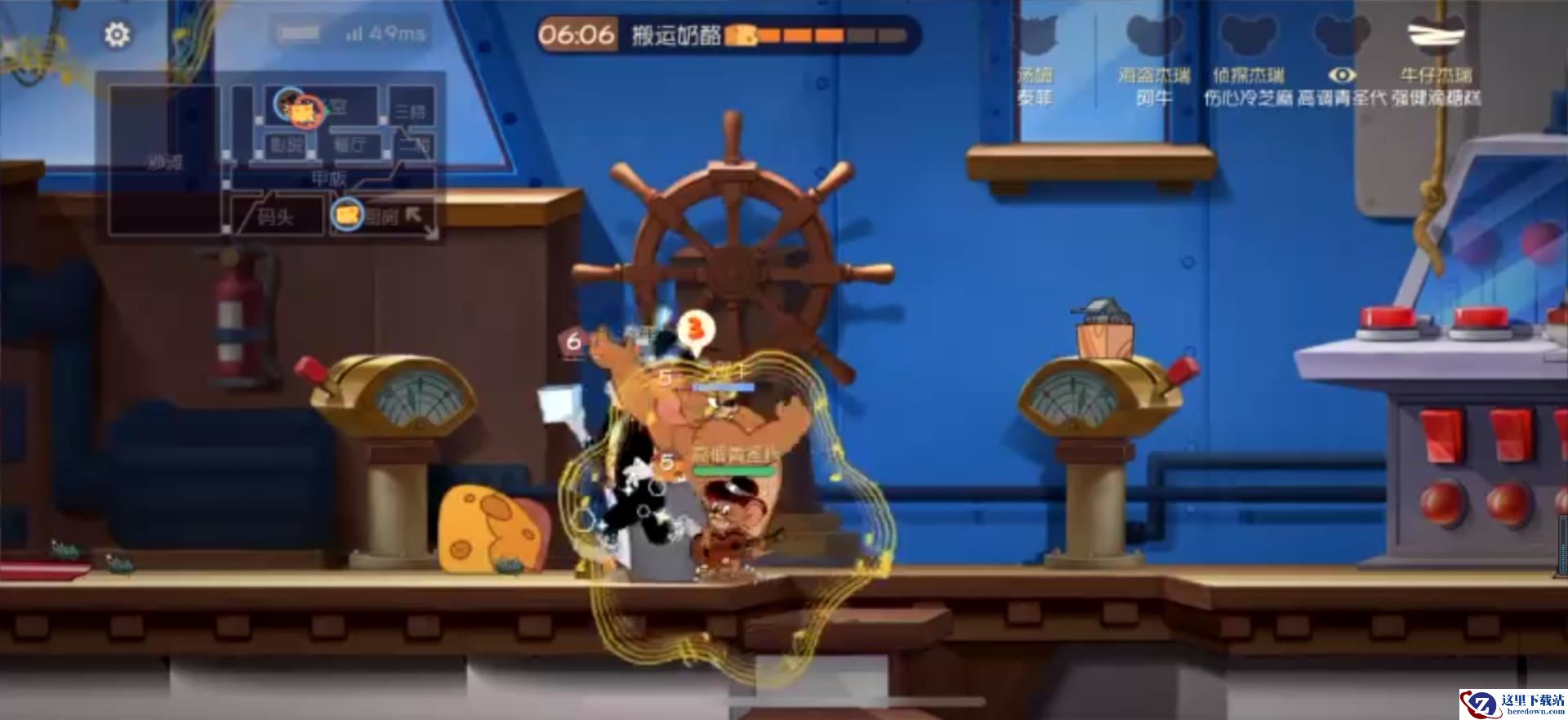 在激烈的猫鼠追逐中,牛仔杰瑞带来了它的吉他,当它使用武器技能“牛仔吉他”时,演奏范围内的猫将受到减速效果,并逐渐进入眩晕状态,。这一技能,无论是用于牵扯猫的攻势,为队友争取搬运奶酪时间,还是在危急时刻用于逃生,都十分好用。