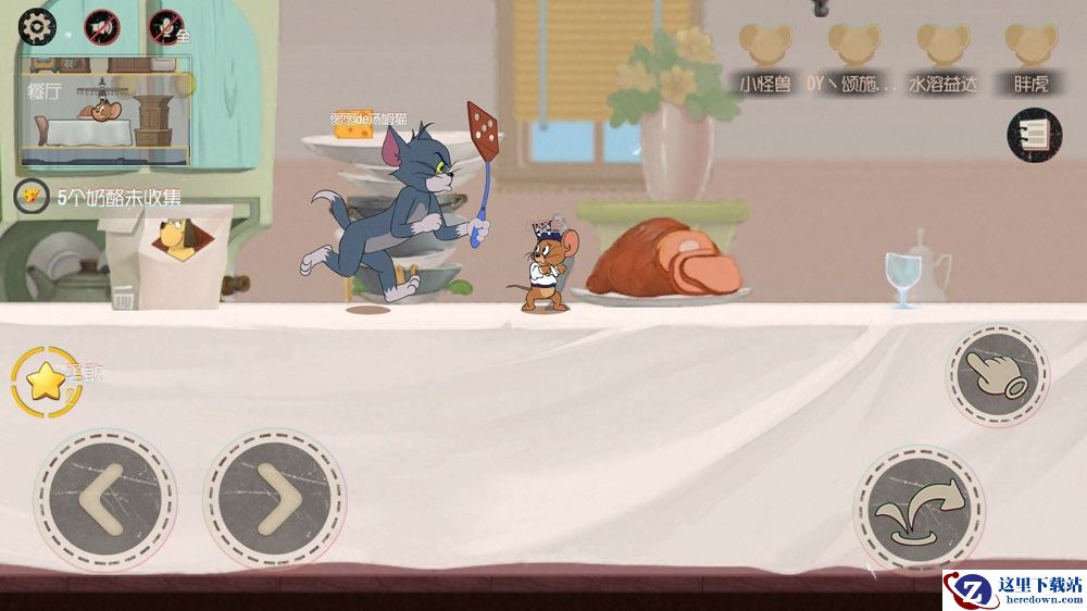 房间散落的道具、美味的食物还有特殊的功效!如汤姆最爱喝的牛奶,可以带来加速效果,并解除角色的眩晕,十分实用。汤姆和杰瑞还各自拥有一些专属道具,比如杰瑞专属的小奶酪,效果与牛奶相近,汤姆专用的老鼠夹可以布置捕鼠陷阱,但假如汤姆不慎踩中,也会被困。汤姆还可以使用苍蝇拍拍打杰瑞,一旦打中,就能把它拍成薄薄的纸片,神还原动画情节!