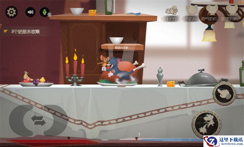 在地图的各个场景内,随机分布着大小奶酪,小奶酪可以食用,而且还能提升杰瑞的速度,吃得饱自然跑得快。大奶酪则是游戏中最重要的任务品,杰瑞必须找到大奶酪并将其带回鼠洞,才能获得胜利的机会。