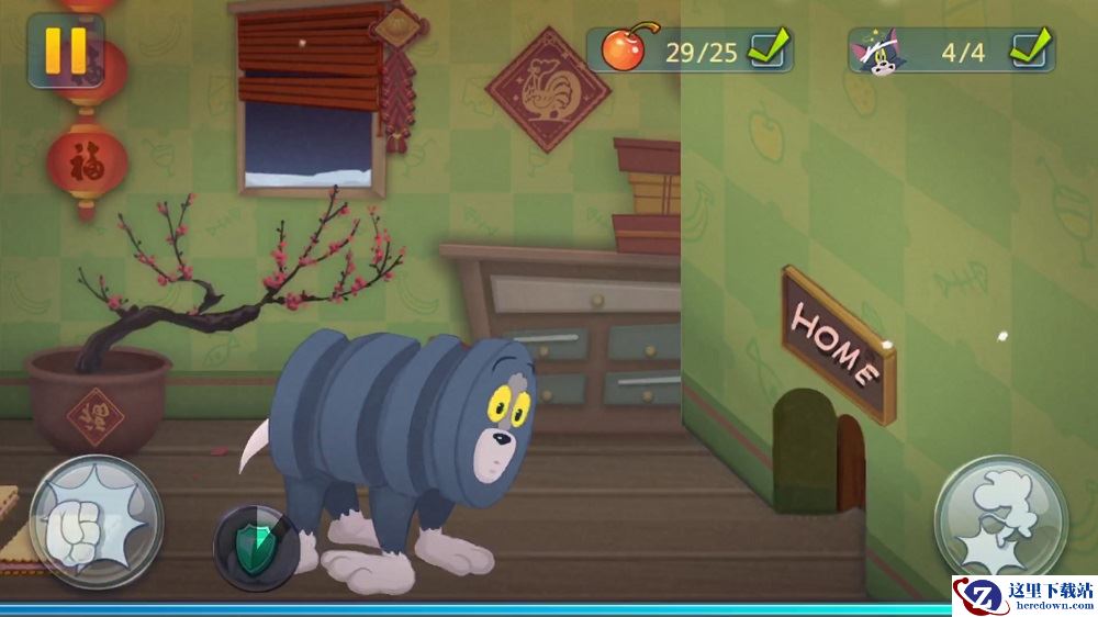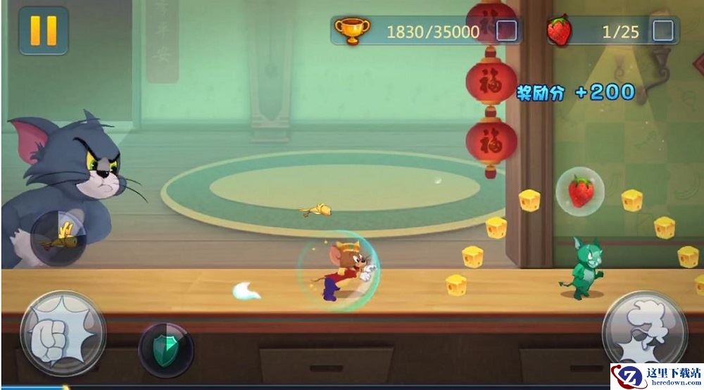 跑酷时玩家除了要通过右键跳跃来躲避障碍物之外,还可以点击左键将盘子踢向汤姆,并且也可以跳跃接住叉子、冰块等,然后再点击左键进行反击。又或者直接将途中捡到的骨头丢给汤姆,然后召唤出无敌斗牛犬Spike将汤姆痛扁一顿出口恶气等,为玩家神一般还原了最熟悉的动画场景,增加了游戏的趣味性,让人忍俊不禁。