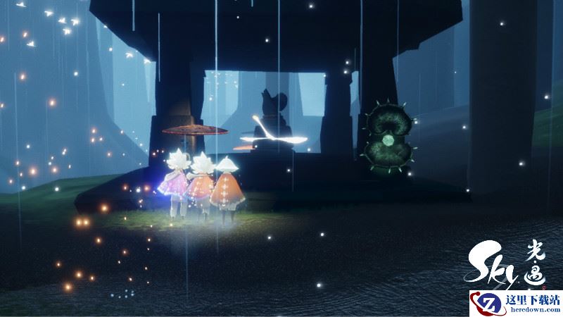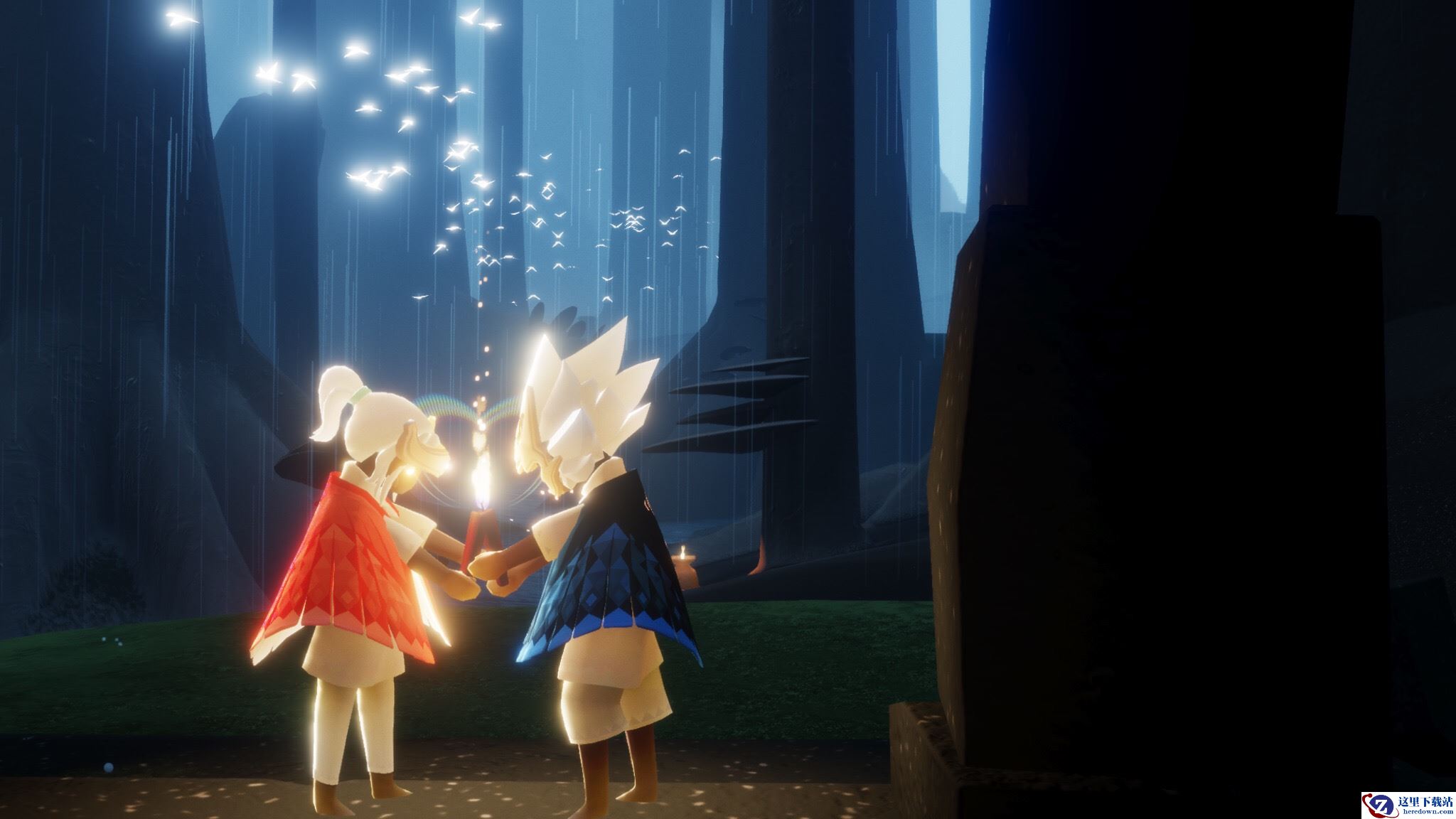 越过明朗开阔的云野,玩家来到了天空王国的第三个场景——“雨林”。天色逐渐变灰,云层不断加厚,密集的丛林中,迷雾四起。天空下着淅淅沥沥的小雨,使玩家难以辨清前方的方向。在雨林中,雨水的击打会使玩家的斗篷能量逐渐消减,心火甚至可能被浇熄。所以,玩家需要更加谨慎的守护心火,不断寻找光源,才能重新点燃心火,恢复飞翔所需的能量。