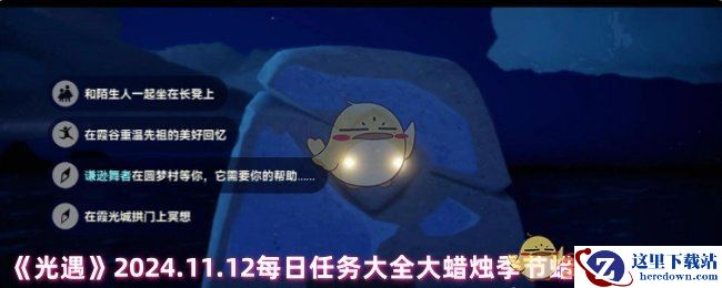 光遇今日任务2024.11.12,光遇游戏的每日任务已更新,游戏中每日任务都会有变更,大蜡烛与季节蜡烛的位置每日都有变化,小编为大家整理了今日11月12日的每日任务与蜡烛位置,还没有开始游戏的玩家可以根据以下地点完成任务哦!大家玩的开心。