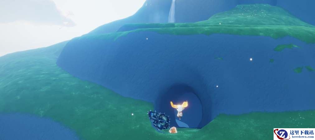 7、在圣岛的瀑布下面有一个在山洞,玩家进去之后能够找到有着牌肚皮动作的先祖。